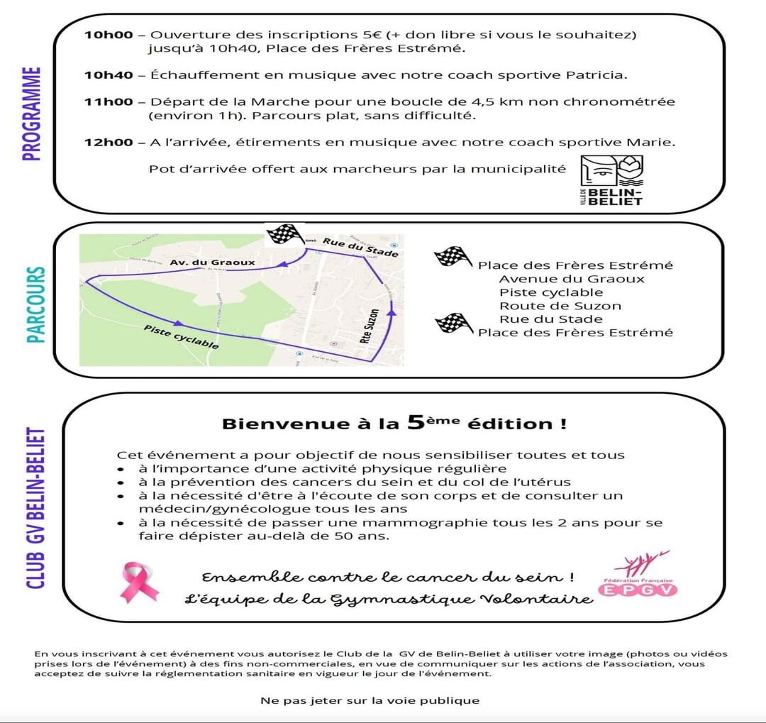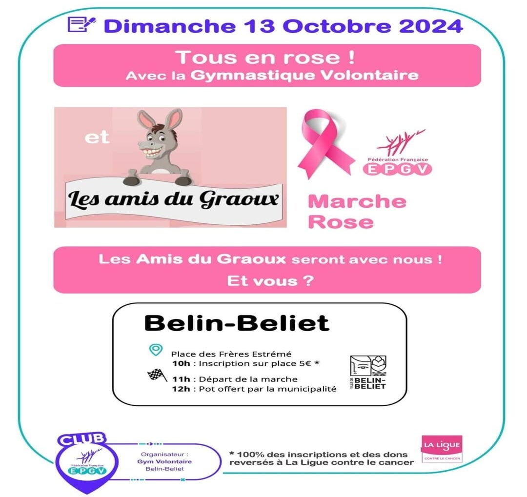 Nous vous attendons nombreux pour partager ce moment de solidarité et de convivialité. Rendez-vous le Dimanche 13 Octobre à 10h sur la place des Frères Estrémé pour les inscriptions (5€), avec un départ prévu à 11h. À midi, un pot sera offert par la municipalité de Belin-Béliet.